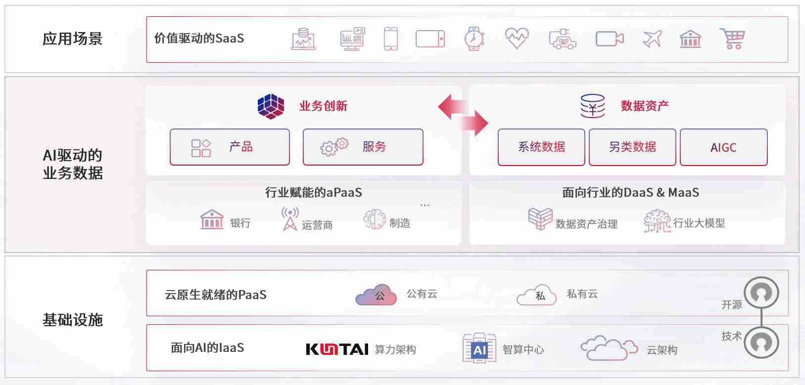数字时代,,围绕企业数字化转型的关键要素,,狗子28数码开创性的提出数云融合战略和技术体系框架,,,,着力在云原生、、、数字原生、、AI原生和信创产业上架构产品和服务能力,,,,为处在不同数字化转型阶段的快消零售、、汽车、、、金融、、医疗、、政企、、、、教育、、、、运营商等行业客户提供泛在的敏捷IT能力和融合的数据驱动能力,,,,构建跨界融合创新的数字业务场景和新业务模式,,,,助力企业级客户建立面向未来的核心能力和竞争优势,,全面推动社会的数字化、、智能化转型升级。。。。